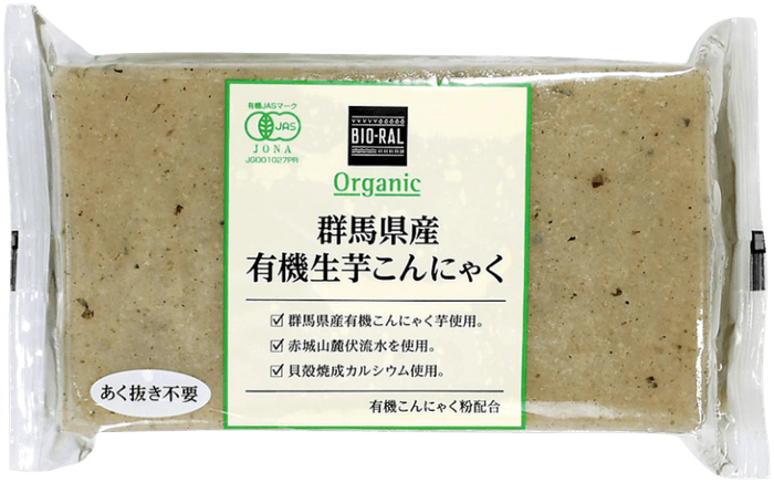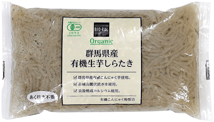 群馬県の赤城自然栽培組合の有機こんにゃく芋と、赤城山系伏流水を使用して作られたこだわりのしらたきとこんにゃく。ホタテ貝の貝殻から作った天然由来の凝固剤、焼成カルシウムを使用しています。