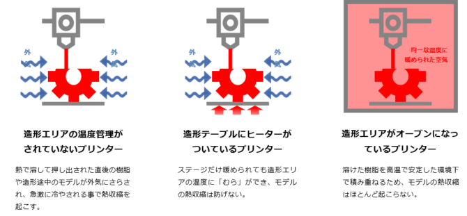 主な理由の一つとして挙げられるのは、「ヒートチャンバー機構」で、造形エリアを徹底した温度管理を行うことで造形安定性を高め、高品質・高精度なモデルを製作します。さらに、様々な工業用エンジニアリングプラスチックに対応しており、現場で求められる強度・耐久性・靭性・剛性・耐摩耗性・対候性などのあらゆる性質を持つ材料を使用できます。溶解性のサポート材も形状自由度を極限まで保つことが可能でストレスを感じさせない仕組みとなっています。