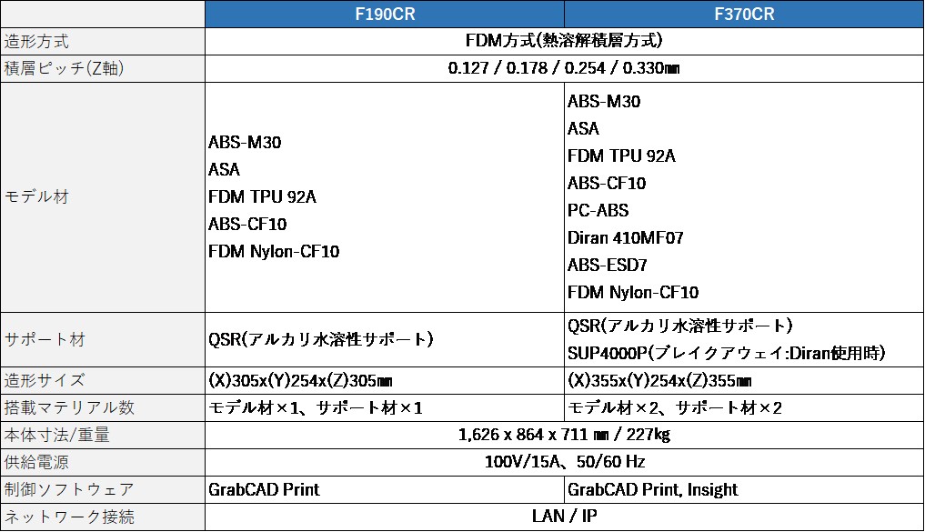 今回、新しく対応した、より高強度を持つ複合材料“FDM(R)Nylon-CF10”、さらに「F370CR」は、複合材料の“PC-ABS”、耐摩耗性材料の“Diran”、放電特性材料の“ABS-ESD7”にも対応します。