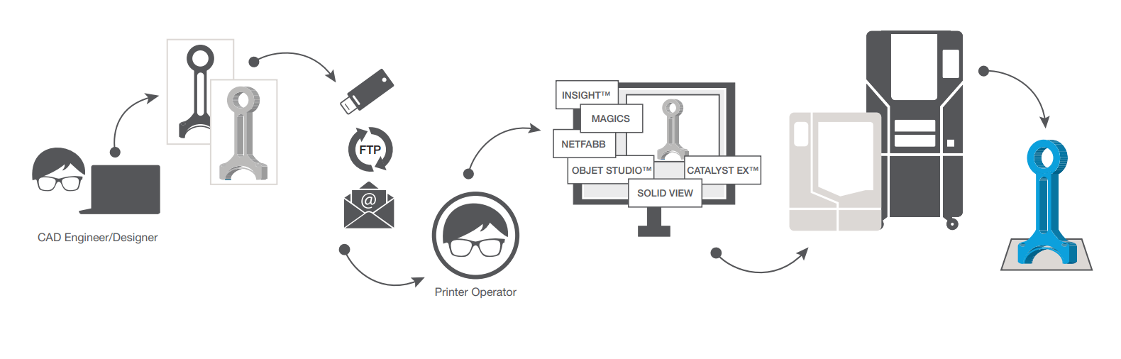 「GrabCAD Print」は3DCADのデータを3Dプリンターに送るためのストラタシス社製3Dプリンター専用ソフトウェアです。一般的に3DCADデータをSTLデータに変換する必要がありますが、「GrabCAD Print」は各種3DCADのネイティブデータの読み込みが可能で、変換時の手間やエラーを気にする必要がなく、直感的な操作で造形の設定を行えるユーザーフレンドリー設計となっています。機能面では、3Dプリントのジョブクラウド管理機能により複数のユーザーや3Dプリンターの稼働状況、造形完了時間、材料の残量の管理が可能で、さらに遠隔モニタリング機能、3Dプリンターと材料の使用履歴を統計的に分析することのできるレポート機能、造形のスケジューリング機能も搭載されています。