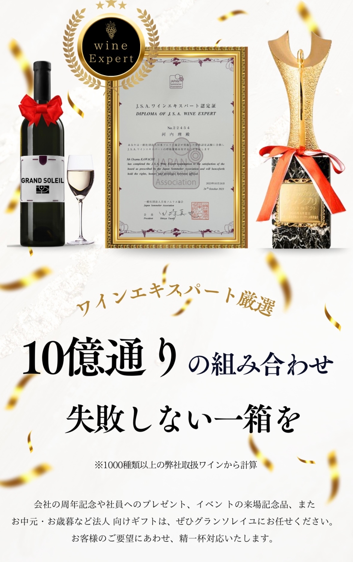 「GRAND SOLEIL(グランソレイユ)」は、ギフトを選ぶ総務・秘書・営業責任者・経営者の方々に向けて、“本当にセンスが伝わる贈り物”を、ワインのプロがご提案します。
