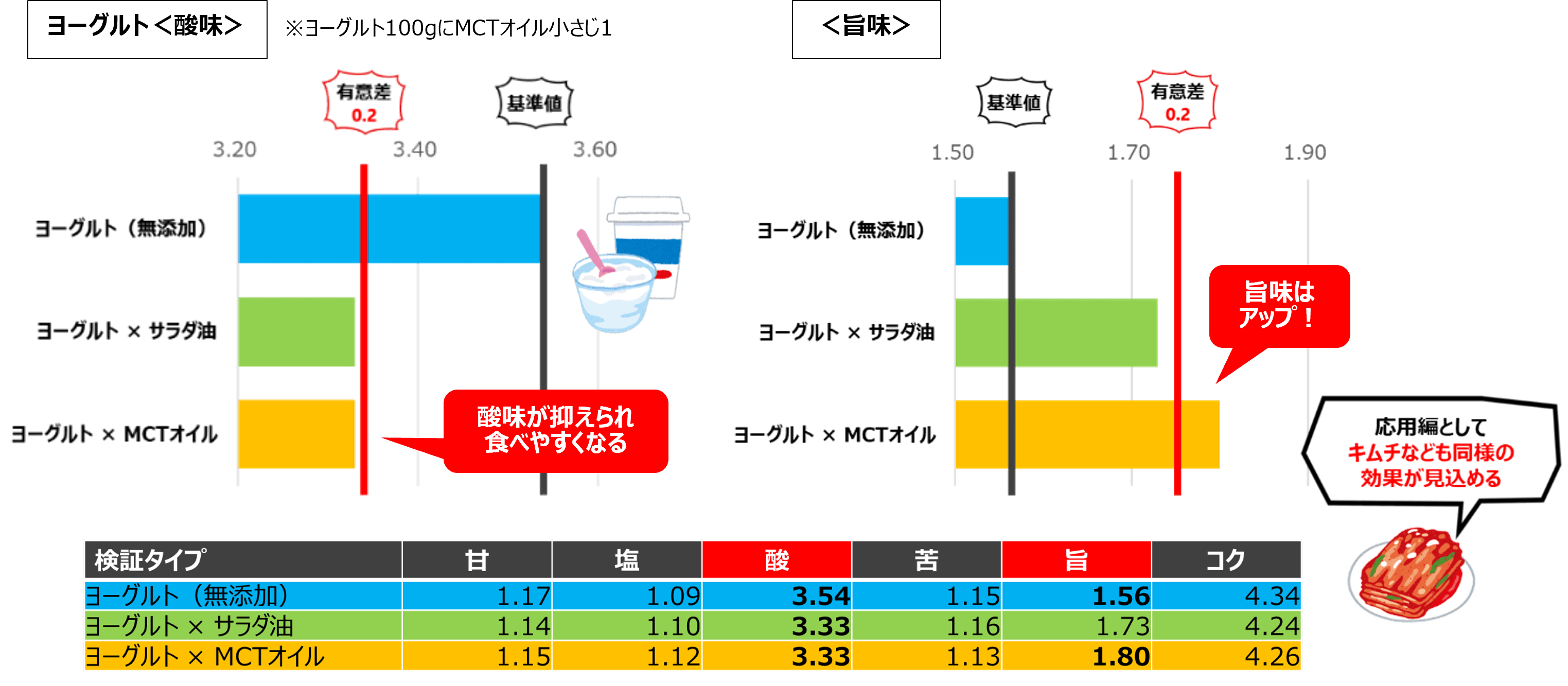 その結果、検証した全ての食材でMCTオイルを加えることによる有意差が確認されました※5。いずれもコクや旨味がアップすることで「美味しさ」に寄与しているほか、ヨーグルトの酸味や温野菜の苦味を低減させる効果が見られたため、より食べやすくなると言えるでしょう。以上のことから「MCTオイル」は、無味無臭なため日常の食事にプラスしやすく、様々な食事の美味しさを高めることが期待できると示唆されます。