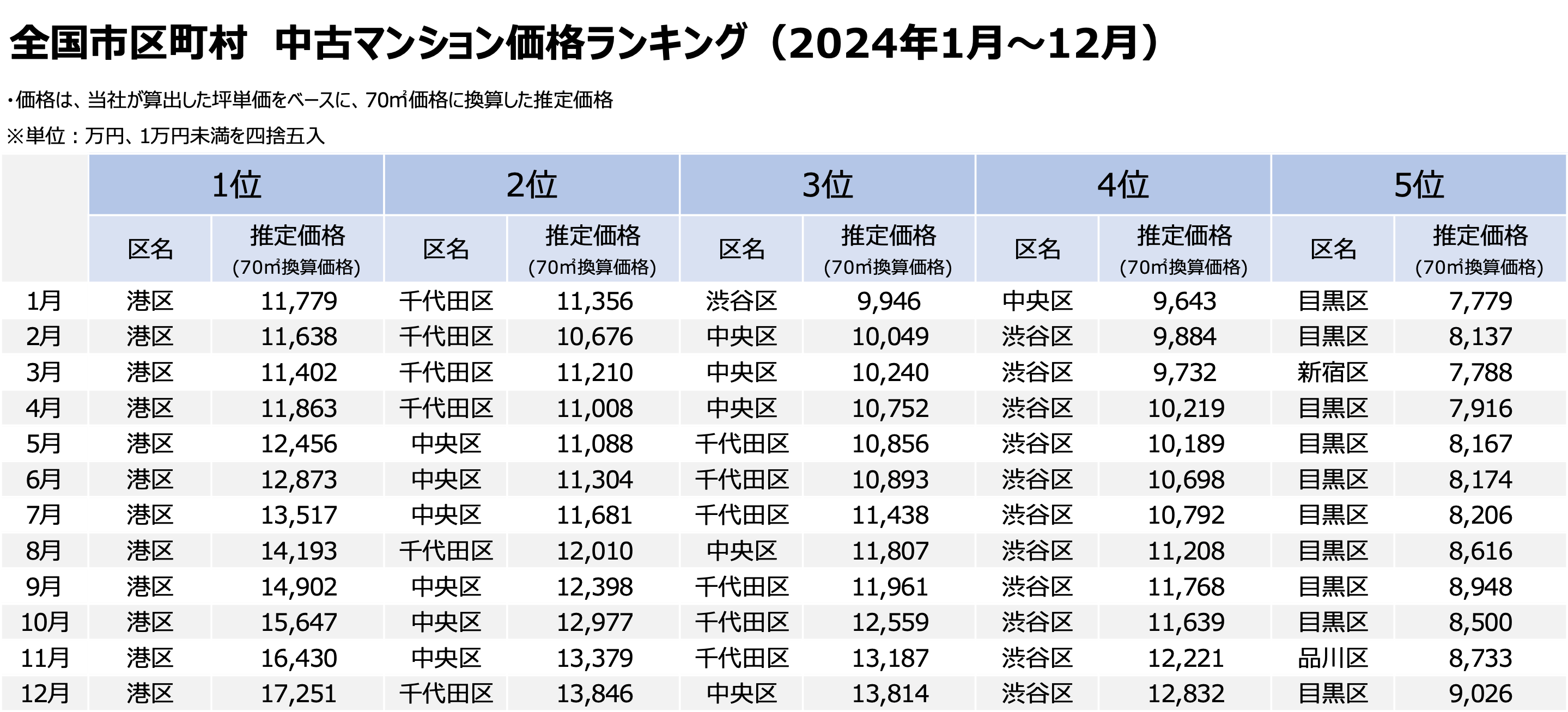 ・2024年12月時点では、「港区」が「千代田区」を大きく引き離し、他区を圧倒する結果となり、また「中央区」は毎月価格上昇が続き、「千代田区」と比肩する存在となった。