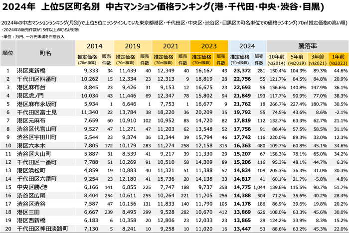 その第1弾として、2024年中古マンション価格ランキングにおいて、年間を通じて上位5位であった東京都港区・千代田区・中央区・目黒区・渋谷区の5区について深掘りし、10・5・3・1年前からの推移と町名単位での中古マンション価格推移を発表いたします。