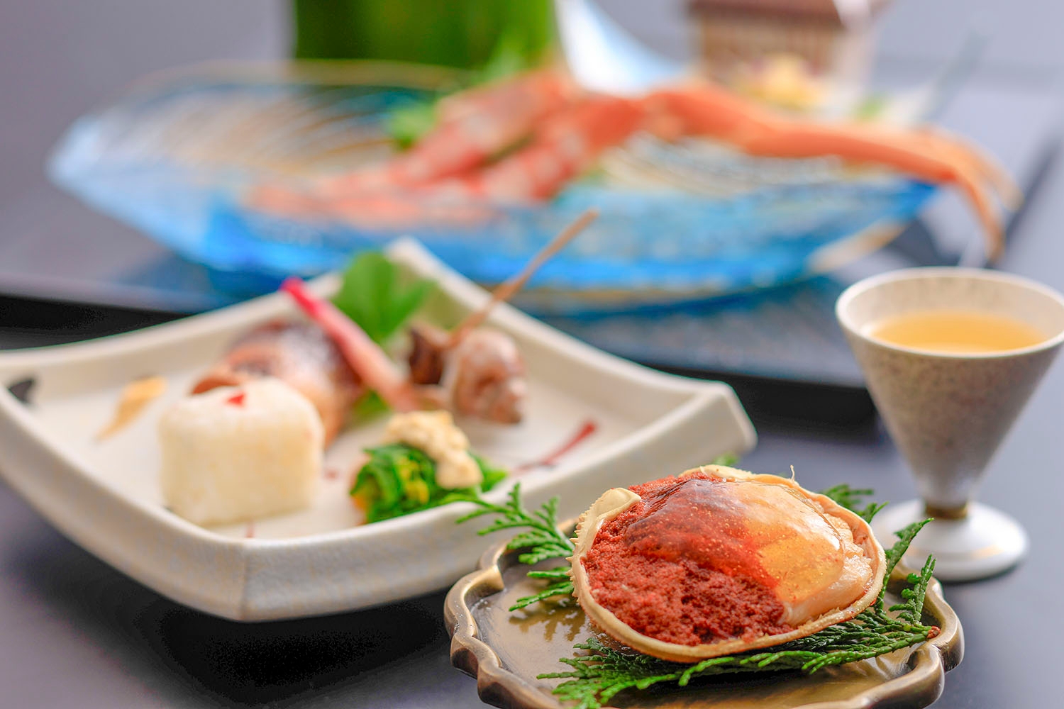 京都府北部に位置する丹後地方は、日本海に面し豊かな自然に恵まれた「海の京都」と呼ばれる地域です。この地で採れる新鮮な魚介類や米などの食材は、料理人たちにとって創作意欲をかき立てる宝の山。そんな食材の宝庫・丹後の食材を使った創作料理を、2023年冬にリニューアルオープンした食事処「風水-FUSUI-」にてご用意いたします。