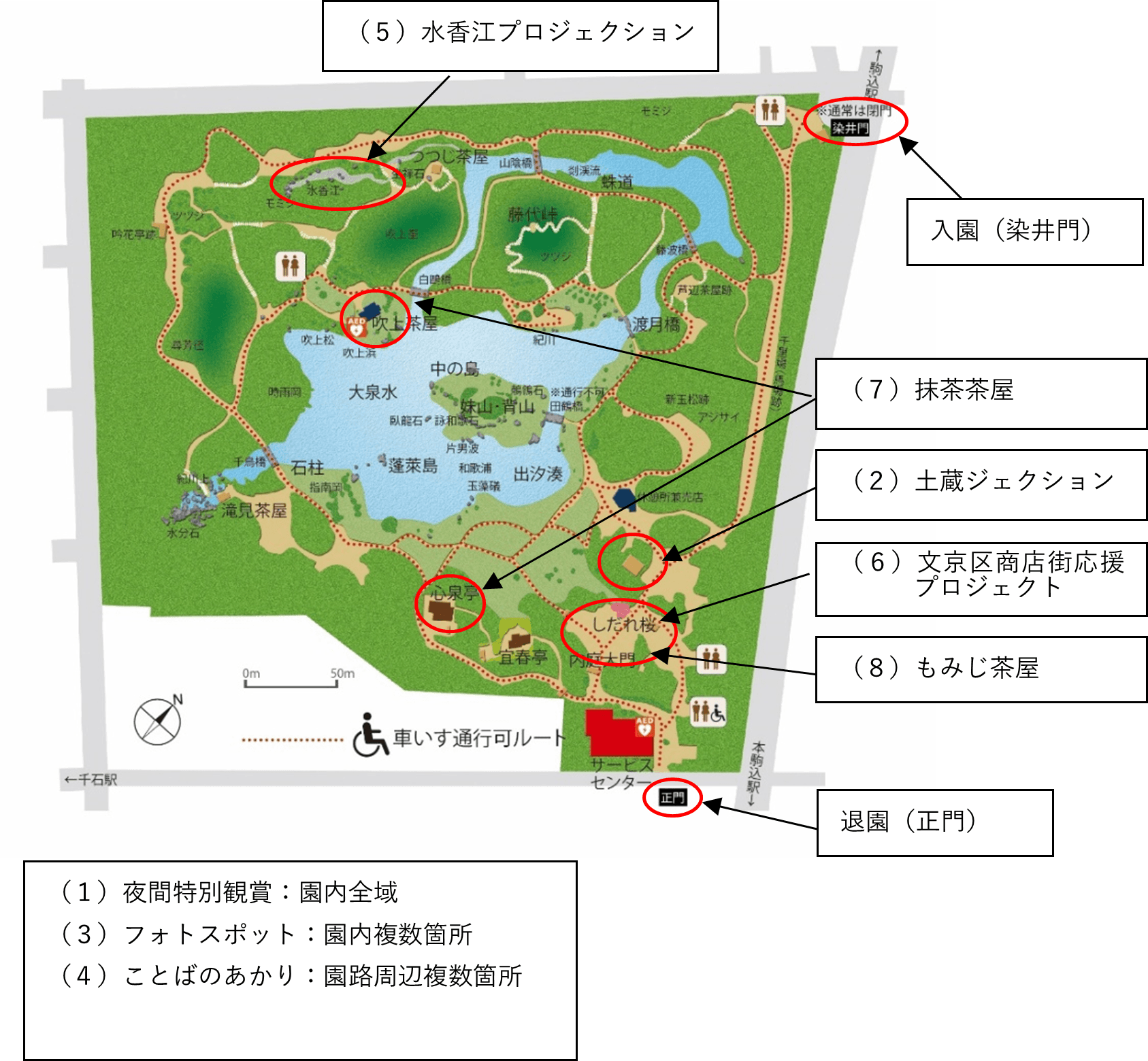 ※17時に一度閉園し、18時から夜間特別観賞のため再開園します。混雑状況によりご入園に待ち時間が発生する場合がございますので、ご了承ください。入園は染井門、退園は正門となります。また、夜間は安全確保のため立ち入りを制限する区域があります。
