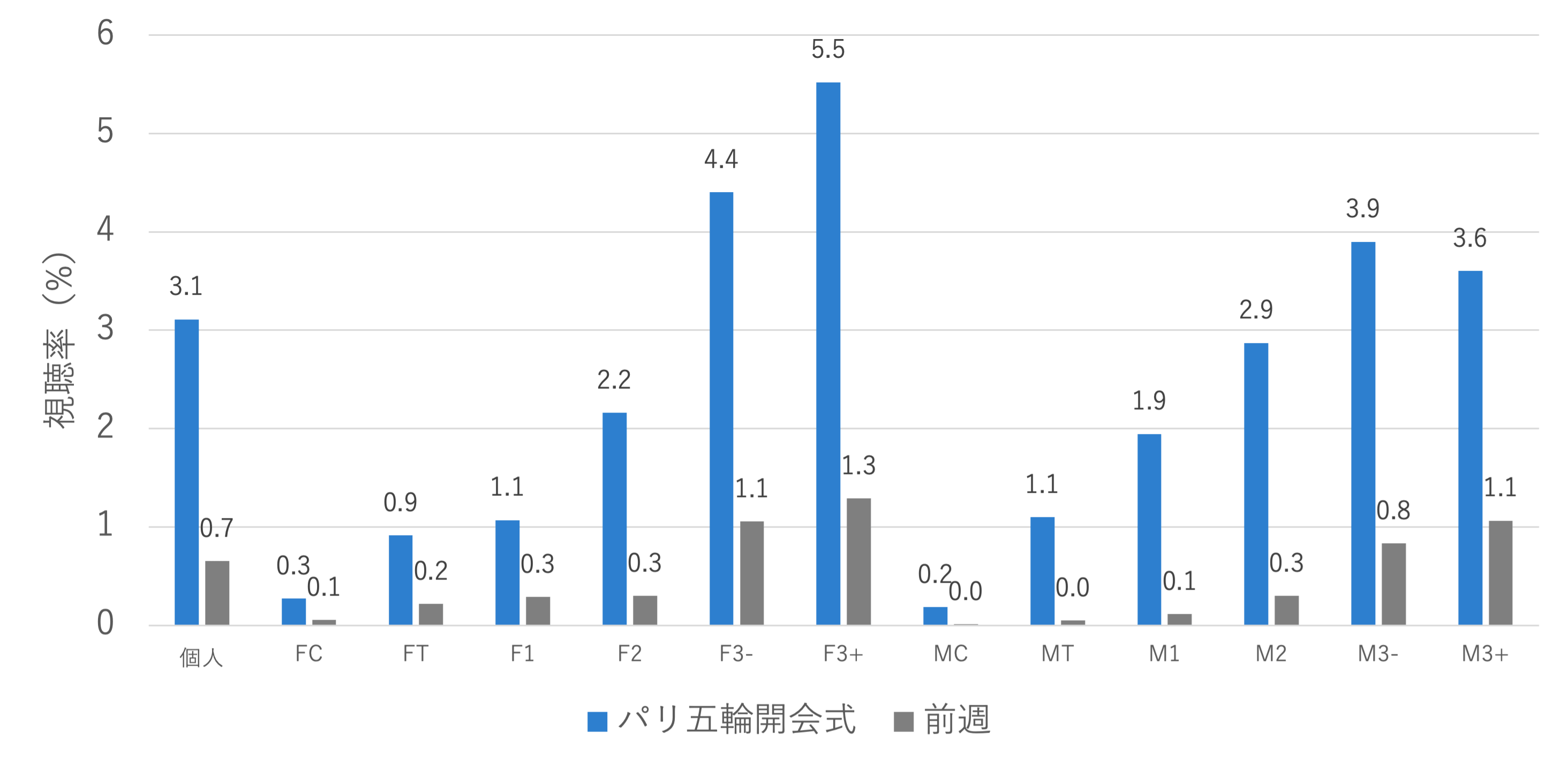 全ての性年代で前週の視聴率を大きく上回り、中でもF3+の視聴率が最も高く5.5%となりました。また、若年層(FT, F1, F2, MT, M1, M2)は前週時点では0.5%未満という非常に低い視聴率だったにも関わらず、今回1〜3%程度の視聴率となっており、オリンピックが幅広い年齢層に訴求できるコンテンツであることが伺えます。