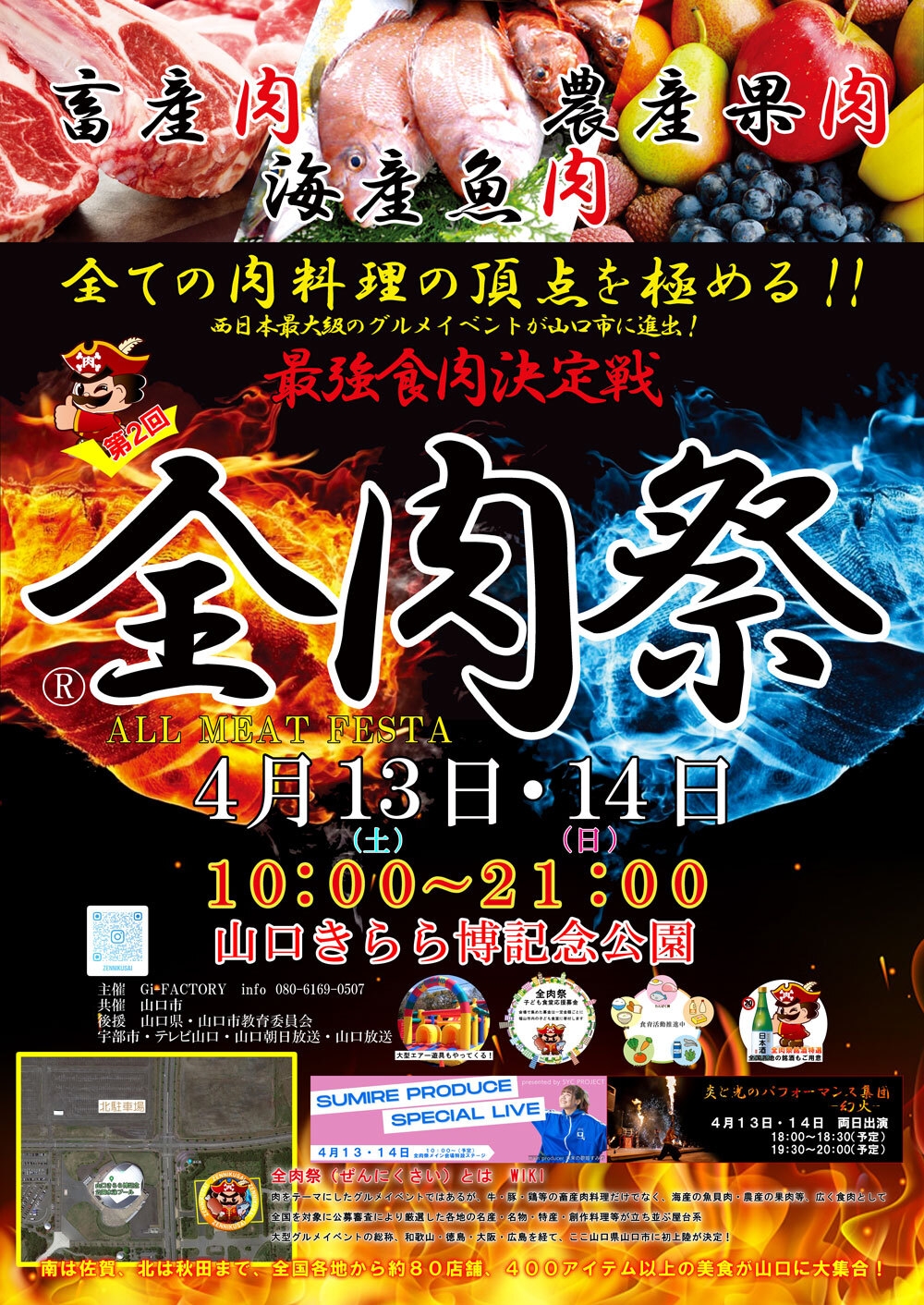 Gi-FACTORYは、和歌山・徳島・大阪・福山・山口・島根・岡山で開催している大型野外グルメイベント『全肉祭』を2024年4月13日~4月14日の2日間、山口県山口市にある山口きらら博記念公園にて第2回開催を行います。