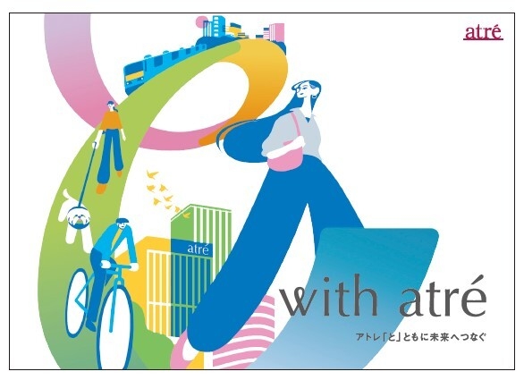 アトレのサステナビリティメッセージ「with atre」を視覚的に表現した、ひらがなの「と」と「架け橋」がモチーフの「atre sustainability Mark」を策定。レポート表紙およびキービジュアルは、イラストレーターの西山 寛紀氏が手掛け、人と街と暮らしの有機的なつながりを表現しています。