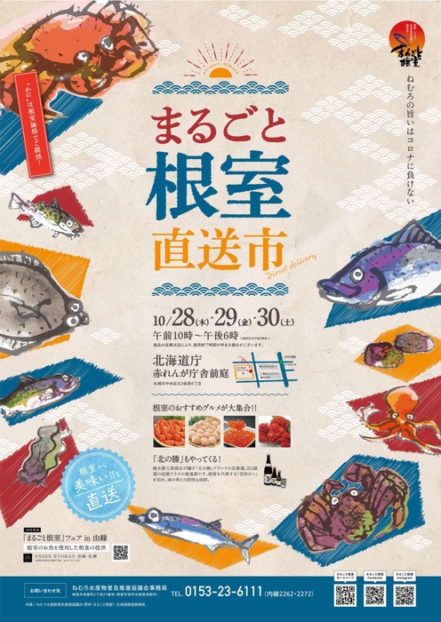ねむろ水産物普及推進協議会(愛称:まるごと根室、会長:根室市長 石垣 雅敏)では、令和3年10月28日(木)~30日(土)の3日間、北海道庁赤れんが庁舎前庭において、「まるごと根室直送市」を開催します。