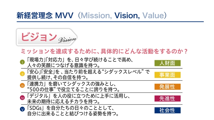シダックス株式会社は、社内外の経営環境や事業ポートフォリオが大きく変化する中、今後もRe-Growth(再成長)を遂げていくためにグループ従業員が共通して目指すべき新たな旗印として、2022年度より、経営理念体系「ミッション(Mission)、ビジョン(Vision)、バリュー(Value)」(以下:MVV)を新たに制定しました。