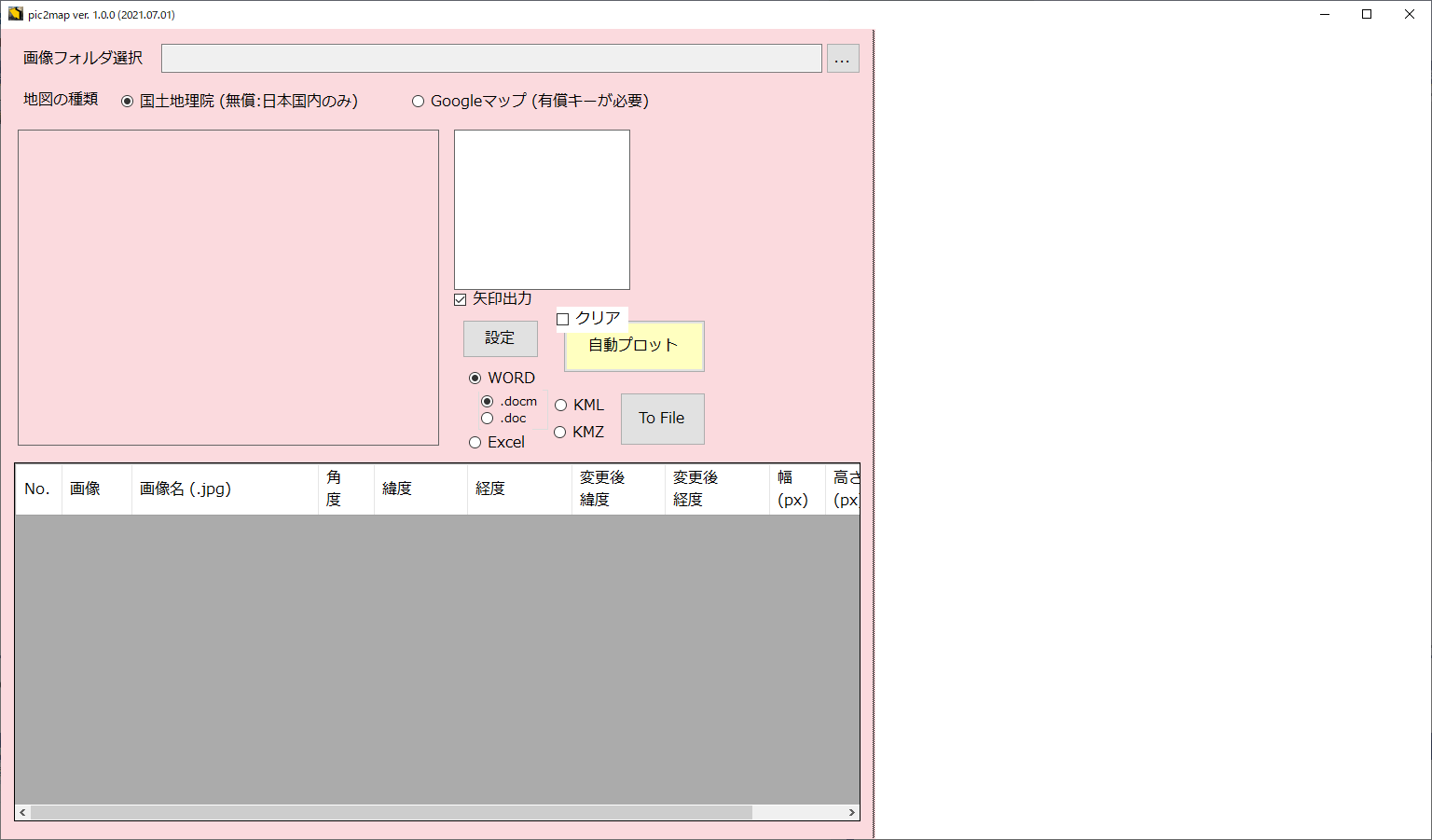 「pic2map」では、アプリ上の画面への地図表示だけではなく、その結果をKML/KMZファイルとして出力し、Googleの無償ソフトウエア「Google earth プロ」で読み込んで地図表示することや、位置と矢印をプロットした地図と写真画像の一覧をWORDやExcelファイルへ出力することができます。