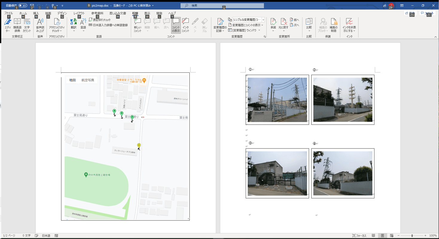 1シート目が地図、2シート目が画像と情報の一覧が出力されます。