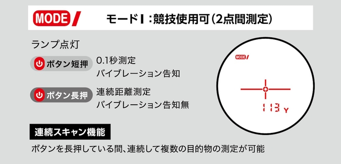 Mボタンを押すと、「モードI(競技使用可)」「モードII(競技使用可)」「モードIII(競技使用不可)」「明るさ調整モード」の順番で切替わります。