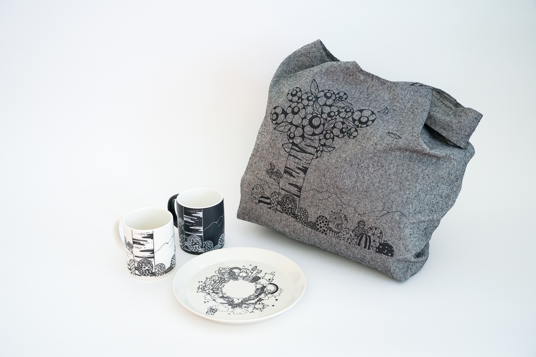 今回制作したグッズは、フラットプレートとマグカップ、トートバッグの3商品で、東川町の大地に共存している生き物たちや自然、文化など、さまざまな要素が散りばめられ、家庭で東川町を感じていただけるようなデザインが描かれています。制作は町内事業者の映像やデザインなどの企画制作を行っている株式会社スノウバグズに依頼しました。
