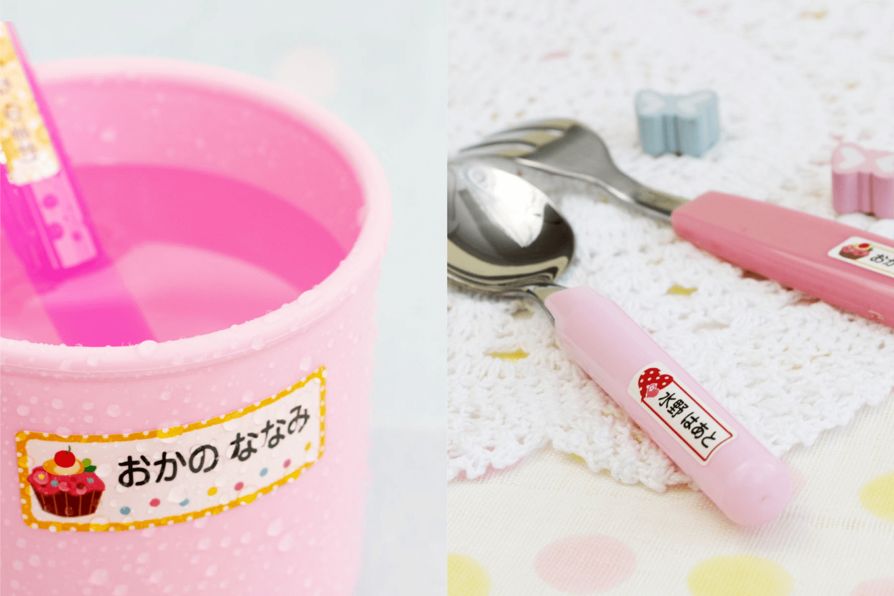 コップや水筒、クレヨンや色鉛筆、お道具箱等に貼ることができます。傘や長靴にも貼ることが可能。外遊びのお砂場グッズに貼れば、他のお子さまと区別がつくので安心です。
