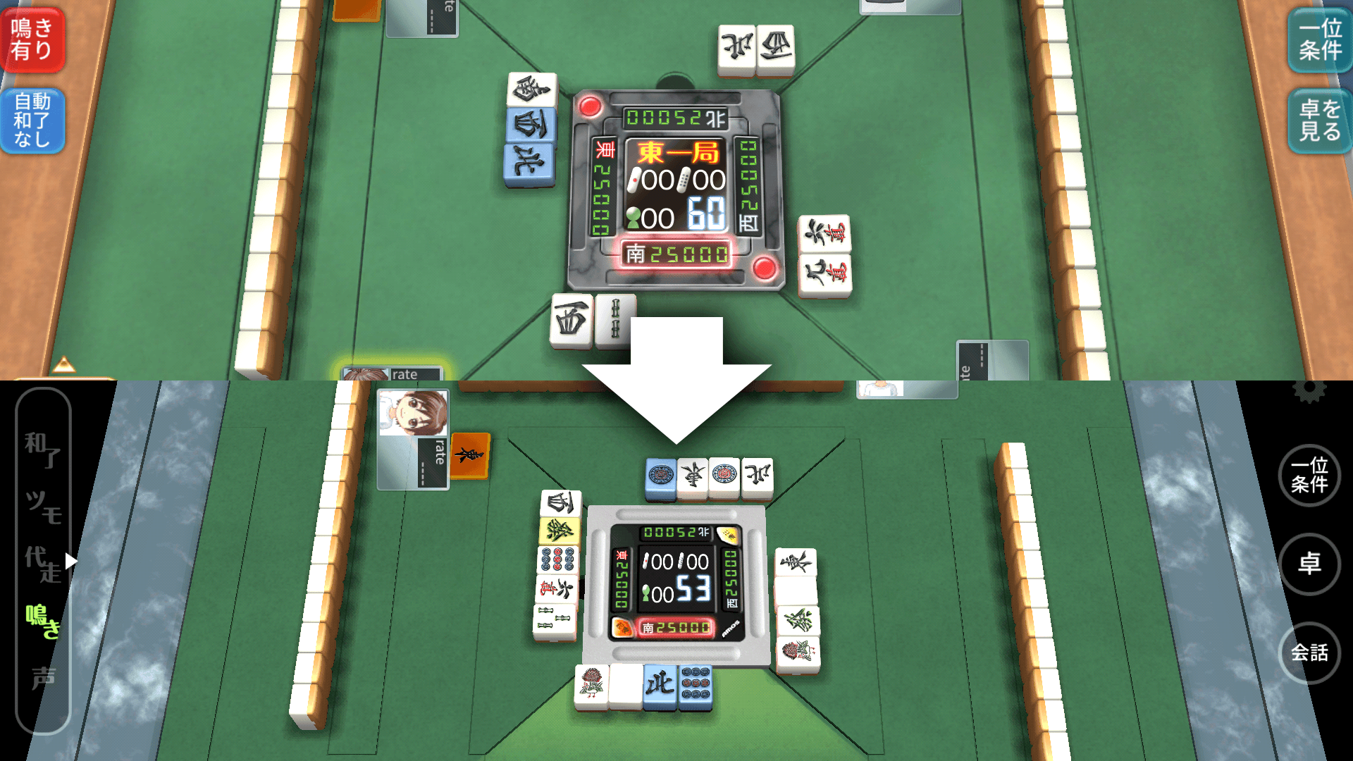 また、対局画面が見づらいというご要望をいただき、メニューをわかりやすくシンプルに調整し、鳴いた牌もメニューで隠れないようにいたします。端末の画面の大きさによって、麻雀牌が小さくて見辛い場合は麻雀卓をダブルタップしていただけますと、雀卓が拡大します。