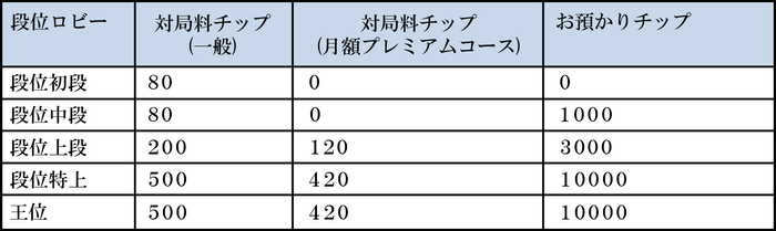 また、各ロビーに応じて対局料チップ、お預かりチップが変化します。