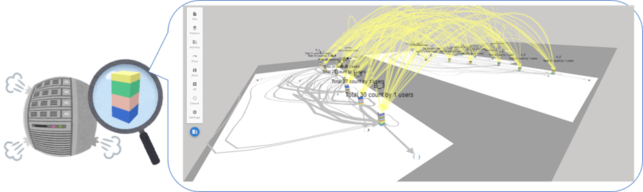 同研究所の創出した新技術とプロセスマイニング※2の技術を組み合わせることで、作成したアプリケーションの利用頻度や、システム全体のオペレーションを3次元で可視化できるという結果が得られました。