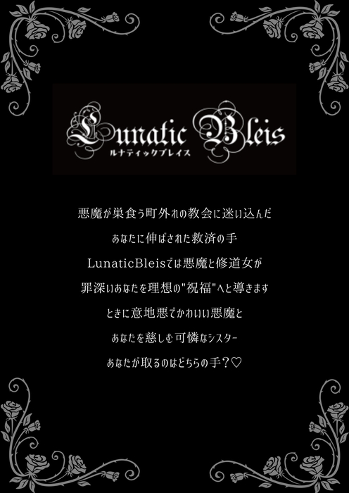 LunaticBleisは、幻想的な空間と心温まるイベントで、あなたの日常に癒しと楽しさをプラスします。ここでしか味わえない悪魔とシスターによる共演を是非、お愉しみ下さい。