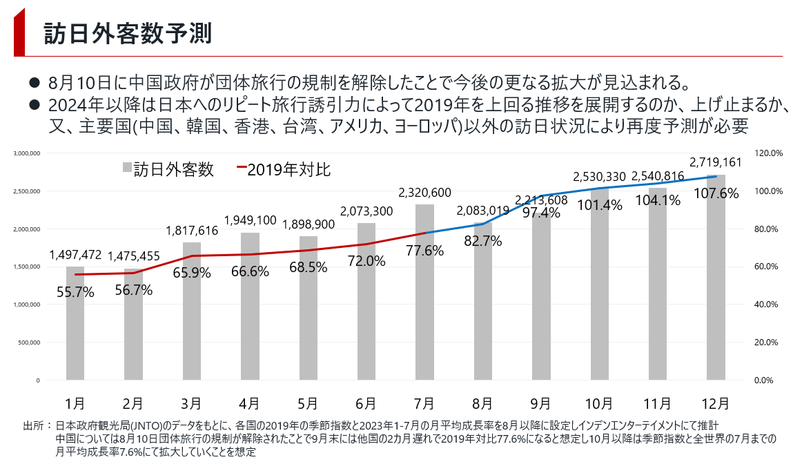 8月10日に中国政府が団体旅行の規制を解除したことで現状2019年対比29.8%の中国観光客の増大が期待されます。