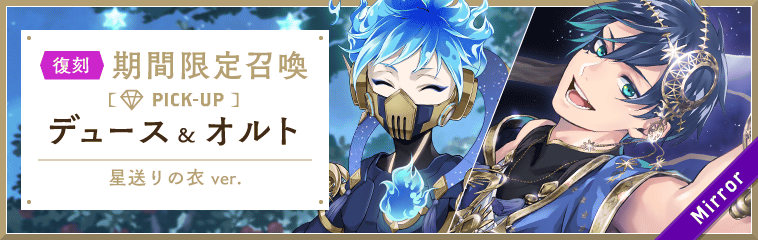 本召喚では、期間限定のSSR デュース[星送りの衣]とSR オルト[スターゲイズ・ギア]が登場します。