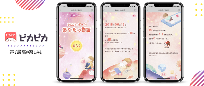 ピカピカ2020レポートである「あなたの物語」は、2020年1月1日から11月30日までの活動履歴データをまとめ、特設ページより物語の口調でユーザーに展示していた。デザインもピカピカのユニークなキャラ「ピカちゃん」を利用し、絵本のようなスタイルであった。デザインの裏側のストーリーとしては、1人の人間は一つの星のように、広い空に散ったら少し寂しいけれど、他の人と繋がったら寂しくなくなり、空いっぱいの綺麗な星空になり、とても美しい世界になれるというもの。ピカピカはその「人と人の繋がり」を作れる音声コミュニティを目指している。