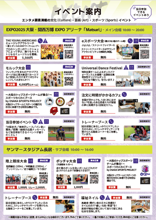 【当日参加OK】~大阪のトップスポーツチームが集合!~スポーツわくわくブース by OSAKA SPORTS PROJECT/Universal Dance Festival/パン食い競争/車椅子レース/即興!絵描き応援メッセージ/注文に時間がかかるカフェ/トレーナーブース/福祉ネイルなど