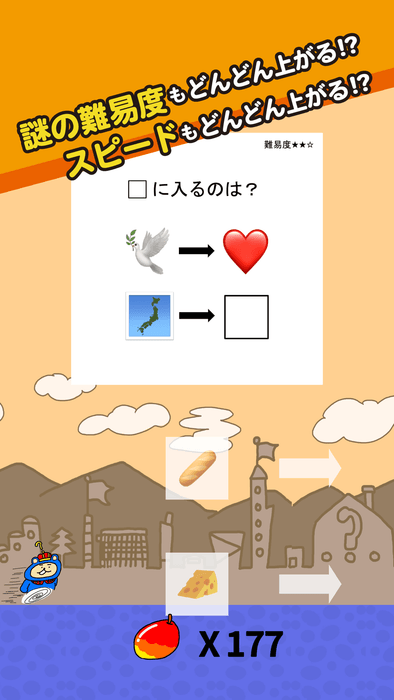 ステージ上には「謎」が仕掛けられたパズルがあり、ジャンプで避けるか、あえて当たって挑戦するかはあなた次第。謎に正解すればボーナスマンゴーをゲット。不正解だとその場でゲームオーバーに。一気に高得点を狙うか、安全に地道に稼ぐか、自由なプレイスタイルでお楽しみいただけます。