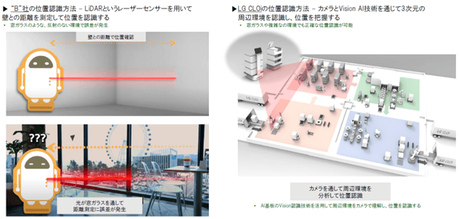 カメラとVision AI技術を通じて3次元の周辺環境を認識して位置を把握するため、窓ガラスや複雑な環境でも正確な位置認識が可能です。また、Visual Featureを使ってドアと壁を区別し、一度通り過ぎた空間を覚えるので、再度同じ空間を通過した際にマップを補正することもできます。