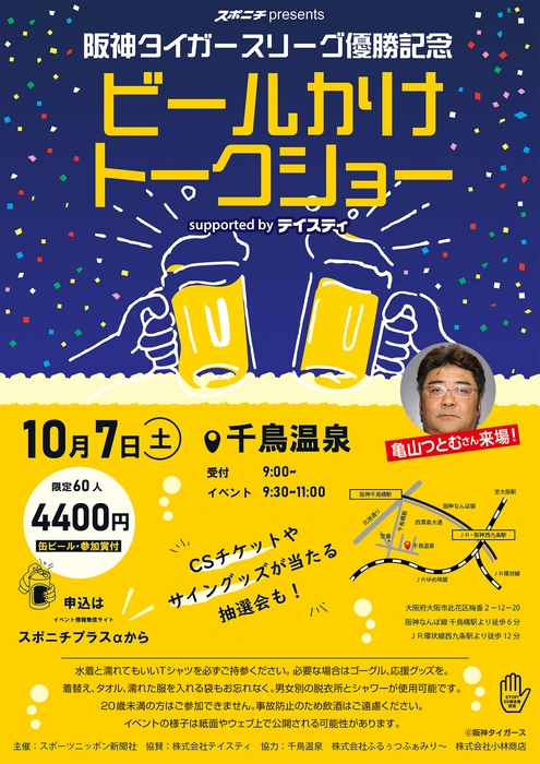 スポーツニッポン新聞社では、阪神タイガースの優勝を祝う「ビールかけトークショー」を開催します。普段体験することのできない憧れのビールかけを一緒にやってみませんか?当日は元阪神でスポニチ本紙評論家の亀山つとむ氏と虎番記者によるトークショーや、CSチケットなどが当たる抽選会も実施予定、参加賞もあります。ぜひご参加ください。