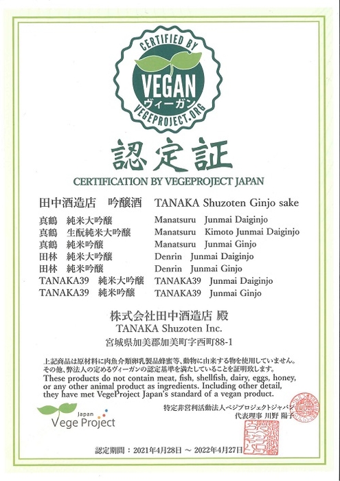 1789年(寛政元年)創業の宮城県・加美町の蔵元「田中酒造店」が 4月28日に日本酒のヴィーガン認証を取得! | NEWSCAST