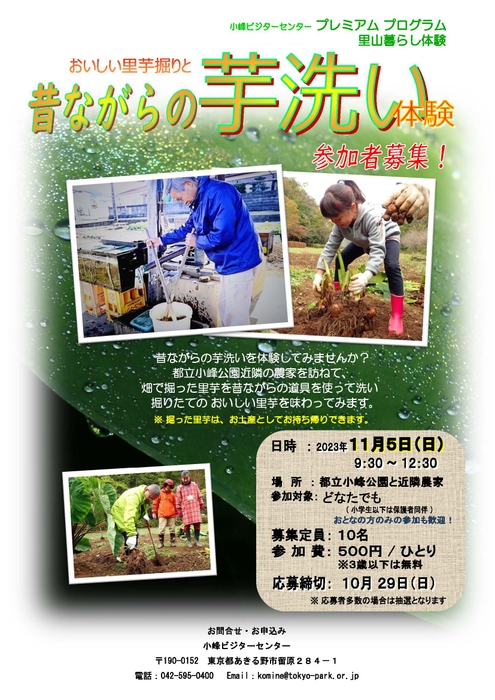 小峰ビジターセンターでは2023年11月5日(日)に「おいしい里芋堀りと昔ながらの芋洗い」イベントを開催します。