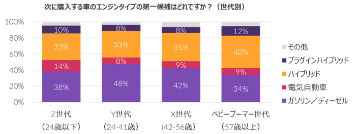 世代別に見ると、Z世代と呼ばれる24歳以下において電気自動車を検討する人は14%で上の世代よりも高い傾向が見られた。しかし、電気自動車だけでなく、ハイブリッド、プラグインハイブリッドも含む代替パワートレイン車全体の意向率は、57歳以上のベビーブーマー世代の61%と最も高い結果であった。