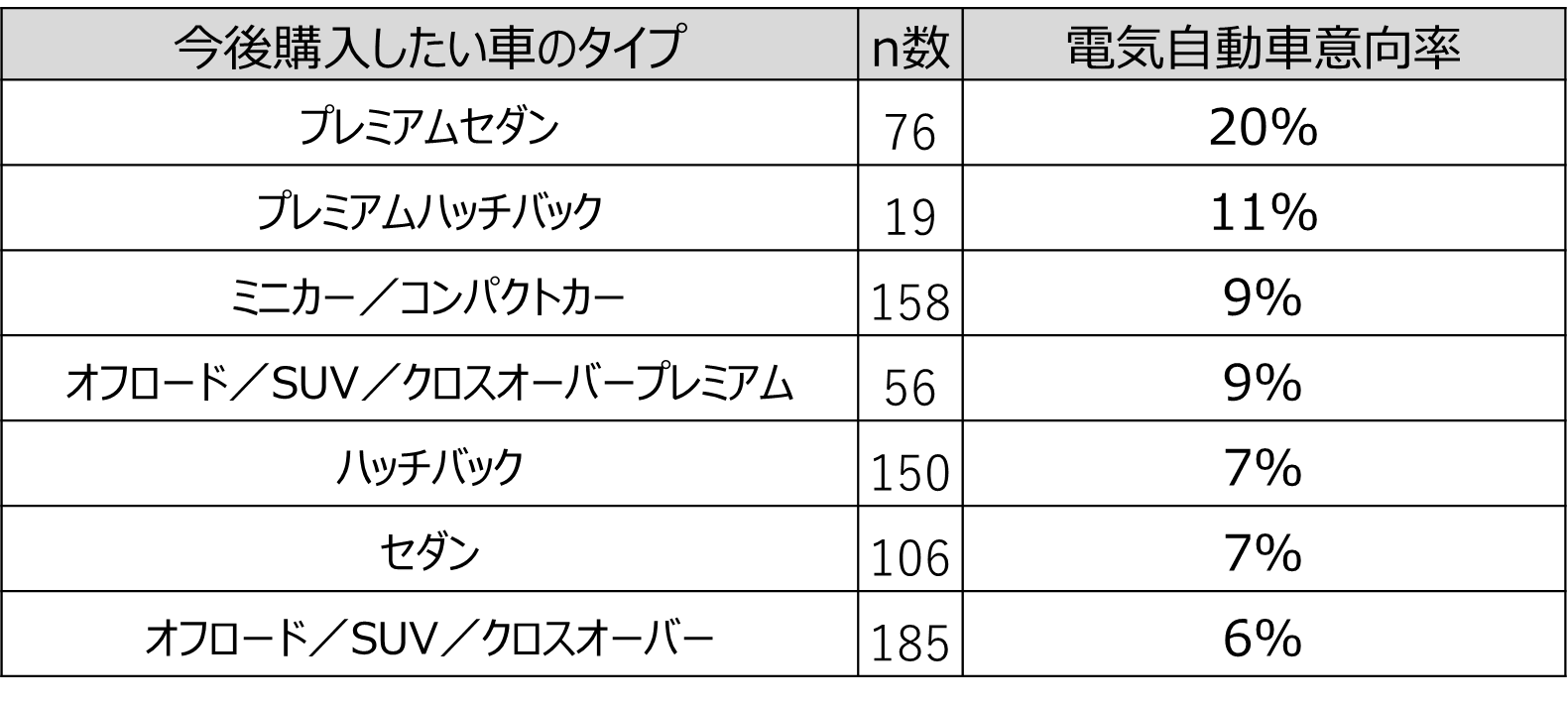 意向する車のタイプ別でみると、電気自動車を意向する人の割合は、プレミアムセダンの意向者において最も高く、プレミアムハッチバック意向者が続き、高級車を求める人において電気自動車に対する意向が高いことが分かった。一方、オフロード/SUV/クロスオーバータイプの購入意向者は比較的電気自動車の意向率が低めであった。