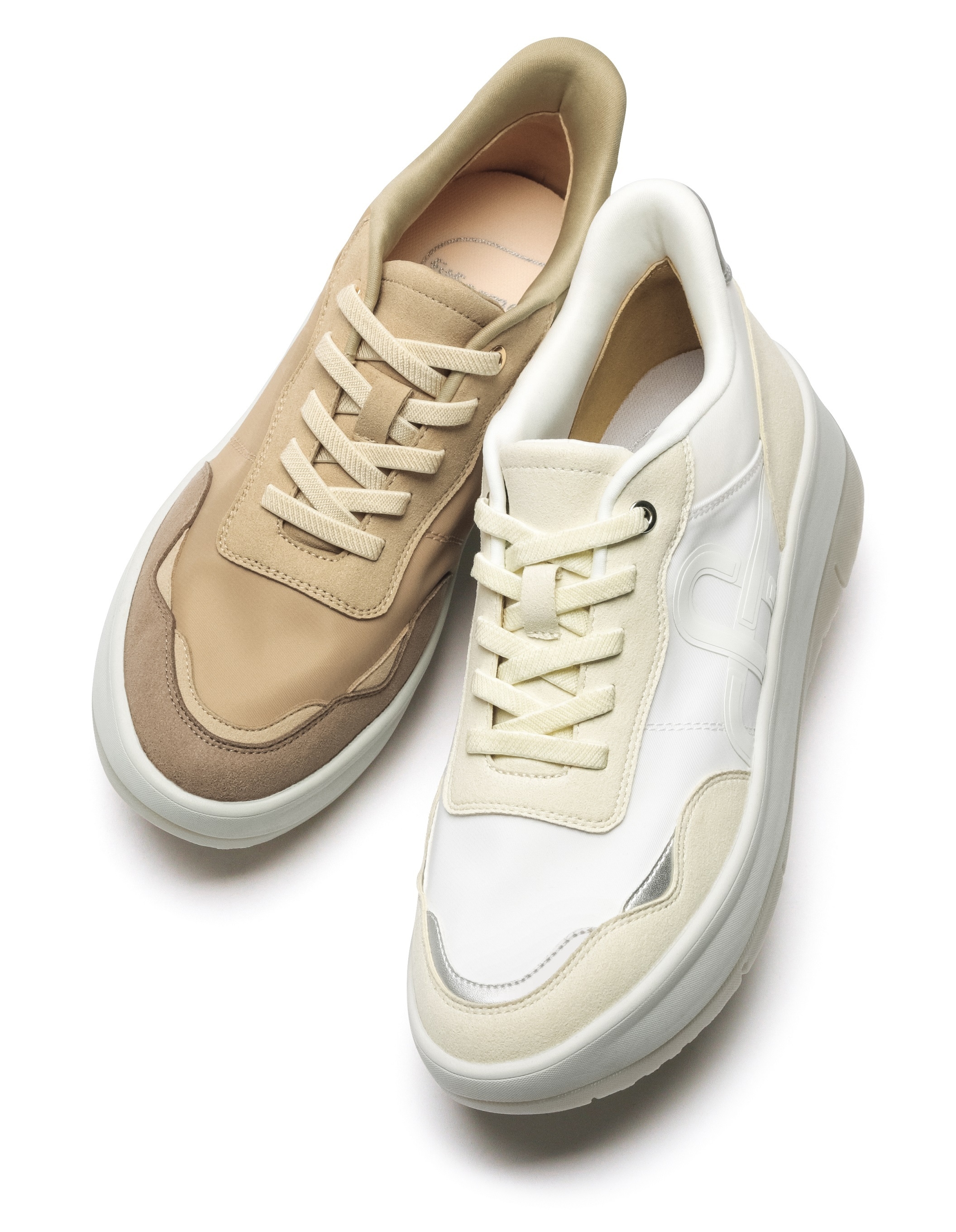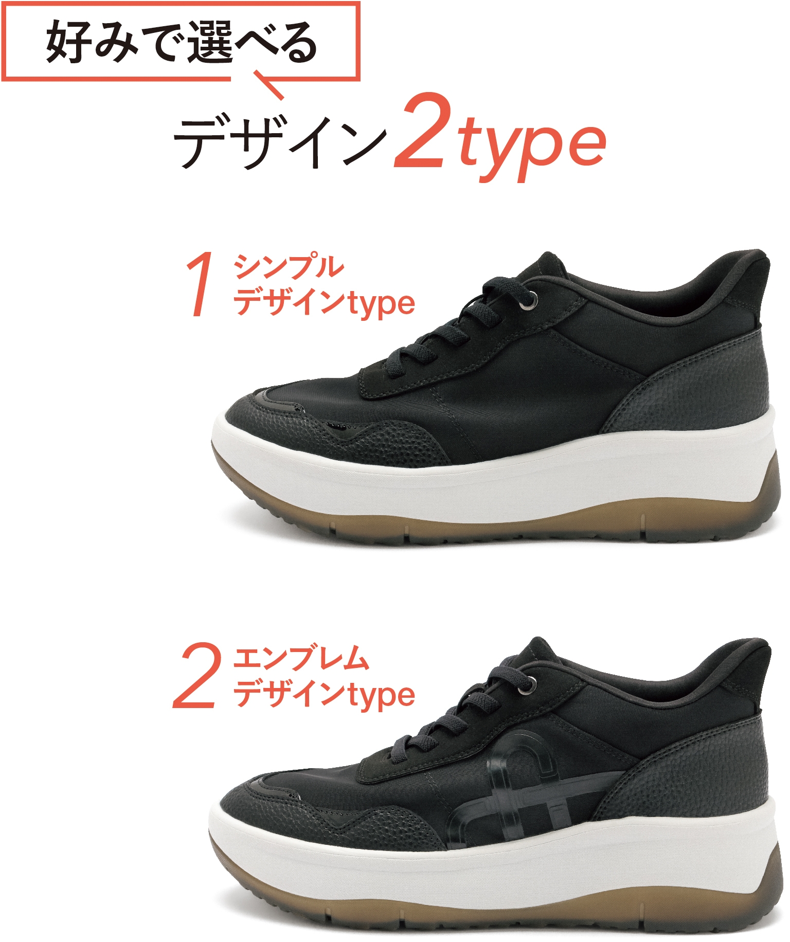 発売から人気No.1スニーカーとして輝き続ける撥水ハンズフリーシリーズ。1年間で2万足以上を発売した大人気シリーズから、足あたりがソフトな生地を使用することで、従来の商品よりも開放的な履き心地に仕上げたモデルを発売いたします。オリジナルのかかと形状による足入れのしやすさはそのままに、街中でもグリップ力を発揮できる全面ラバーのアウトソールにアップデート。ソールは約5.5cmと厚底ながら軽く、屈曲性に優れているので、快適な歩行をサポートします。シューレースには、締め付け感をゆるめた平ゴムを使用。ほかのモデルと比べ、マグネットパーツやビジューハトメの無いシンプルなデザインにまとめ、6色中3色にはサイドにダブルハートのエンブレムを施すことで、好みの1足をお選びいただけるように仕上げています。