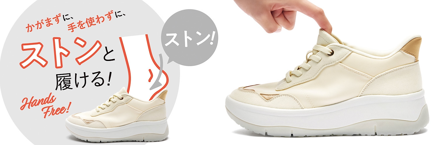 - 靴ベラ状のモールドパーツにより、手を使わずにかがまずに、スッと履いていただけます。平ゴムのシューレースを採用しているため、紐を結ぶ手間もありません。シュータンはクッション入りで、足あたりにも配慮しています。
