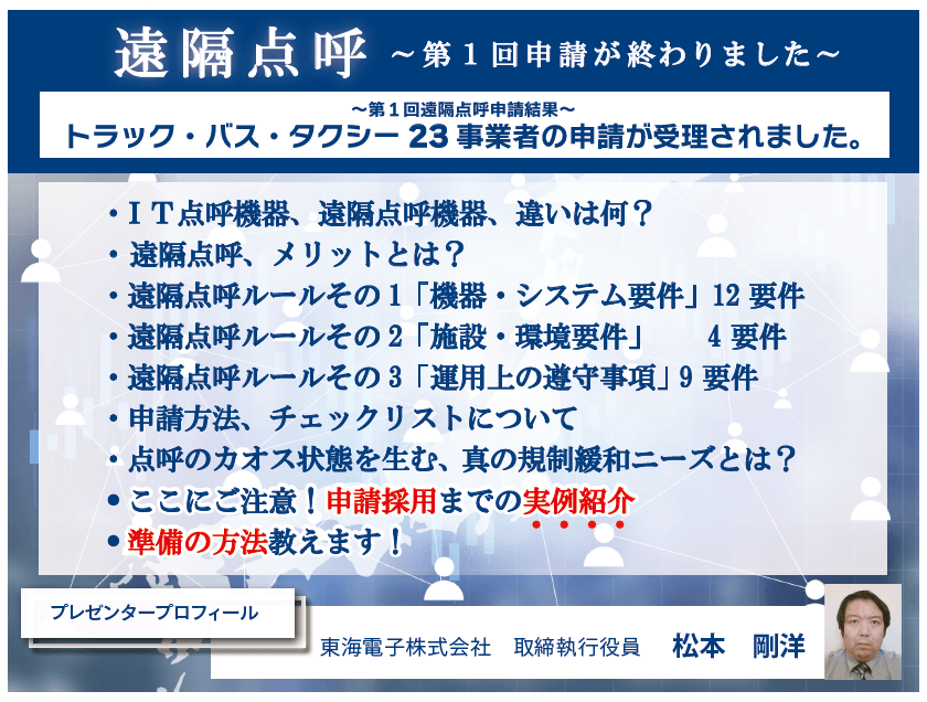 遠隔点呼実績11社、東海電子シェア率47.83%!遠隔点呼申請のツボ教えます!セミナー8月8日(月)開催のお知らせ