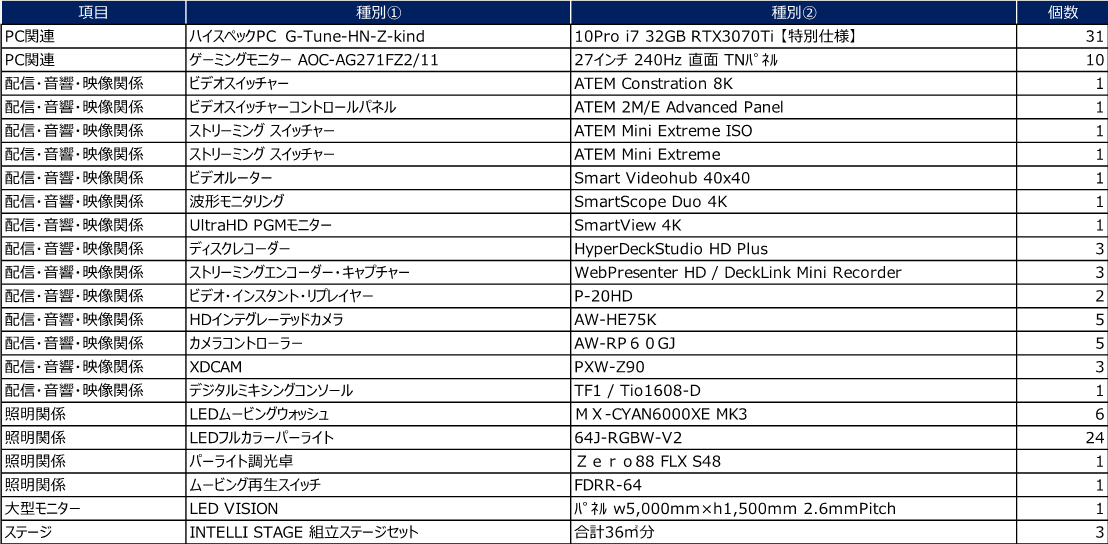 設 備:ゲーミングPC:31台 音響・録音・録画・配信設備、通信設備