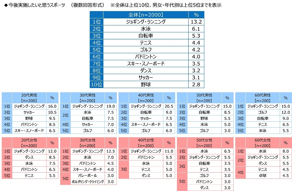 また、今後実施したいと思うスポーツを聞いたところ、1位「ジョギング・ランニング」(13.2%)、2位「水泳」(6.1%)、3位「自転車」(5.3%)、4位「テニス」(4.4%)、5位「ゴルフ」(4.2%)となりました。