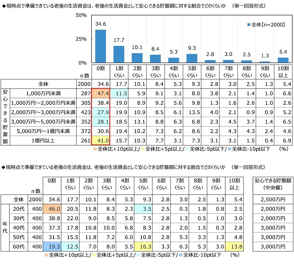 現時点で安心できる貯蓄額に対しどのくらい準備できている? 「0割」が35%で最多