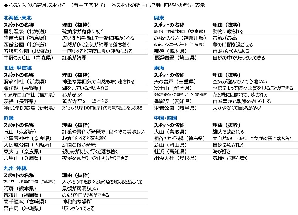全回答者(2,000名)に、お気に入りの“癒しスポット”を聞いたところ、北海道・東北では「登別温泉:硫黄泉が身体に効く」や「猪苗代湖:広い湖と磐梯山を一緒に眺められる」、「函館公園:自然が多く空気が綺麗で落ち着く」、「五稜郭公園:一回りすると適度に良い運動になる」、関東では「恩賜上野動物園:動物に癒される」や「みなとみらい:景観が最高」、「東京ディズニーリゾート:夢の時間を過ごせる」、「那須:自然がたくさんある」、北陸・甲信越では「彌彦神社:神聖な雰囲気で自然もあり癒される」や「諏訪湖:湖を見ていると癒される」、「平泉寺白山神社:心が安らぐ」、「姨捨:善光寺平を一望できる」、東海では「天の岩戸:空気が澄んでいて心地いい」や「富士山:季節によって様々な姿を見ることができる」、「安城産業文化公園デンパーク:花と緑に囲まれて、癒される」、「香嵐渓:自然豊かで季節を感じられる」、近畿では「嵐山:紅葉や景色が綺麗で、食べ物も美味しい」や「立里荒神社:お参りをすると落ち着く」、「大阪城公園:庭園の桜が綺麗」、「東大寺:親しみがあり、行くと落ち着く」、中国・四国では「大山:雄大で癒される」や「祖谷のかずら橋:大自然の中にあり、空気が綺麗で落ち着く」、「蒜山:自然に癒される」、「出雲大社:気持ちが落ち着く」、九州・沖縄では「マリンワールド海の中道:大水槽の中を悠々と泳ぐ魚を眺めると癒される」や「阿蘇:景観が素晴らしい」、「筑後川:のんびり日光浴ができる」、「宮古島:リフレッシュできる」といった回答がありました。
