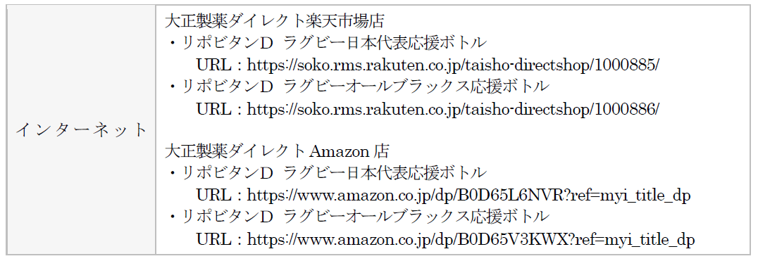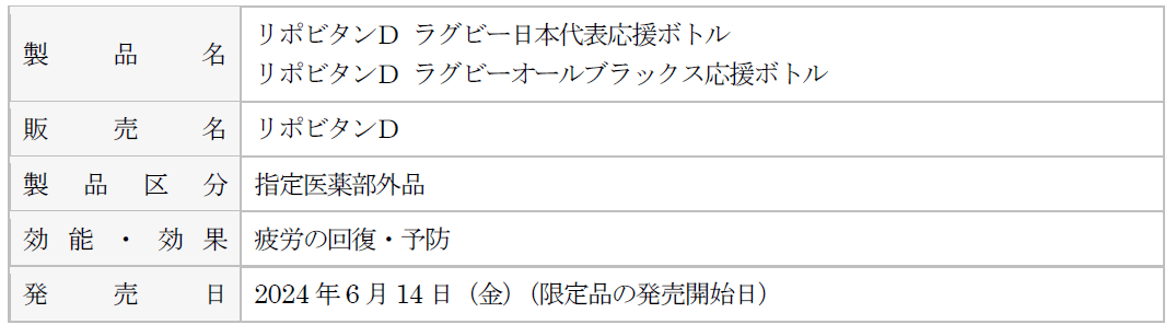 大正製薬株式会社[本社:東京都豊島区 社長:上原 茂](以下、当社)は、リポビタンDの限定ボトル「リポビタンD ラグビー日本代表応援ボトル」と「リポビタンD ラグビーオールブラックス応援ボトル」を、当社オンラインショップ“大正製薬ダイレクト”等にて、6月14日(金)より数量限定発売いたします。