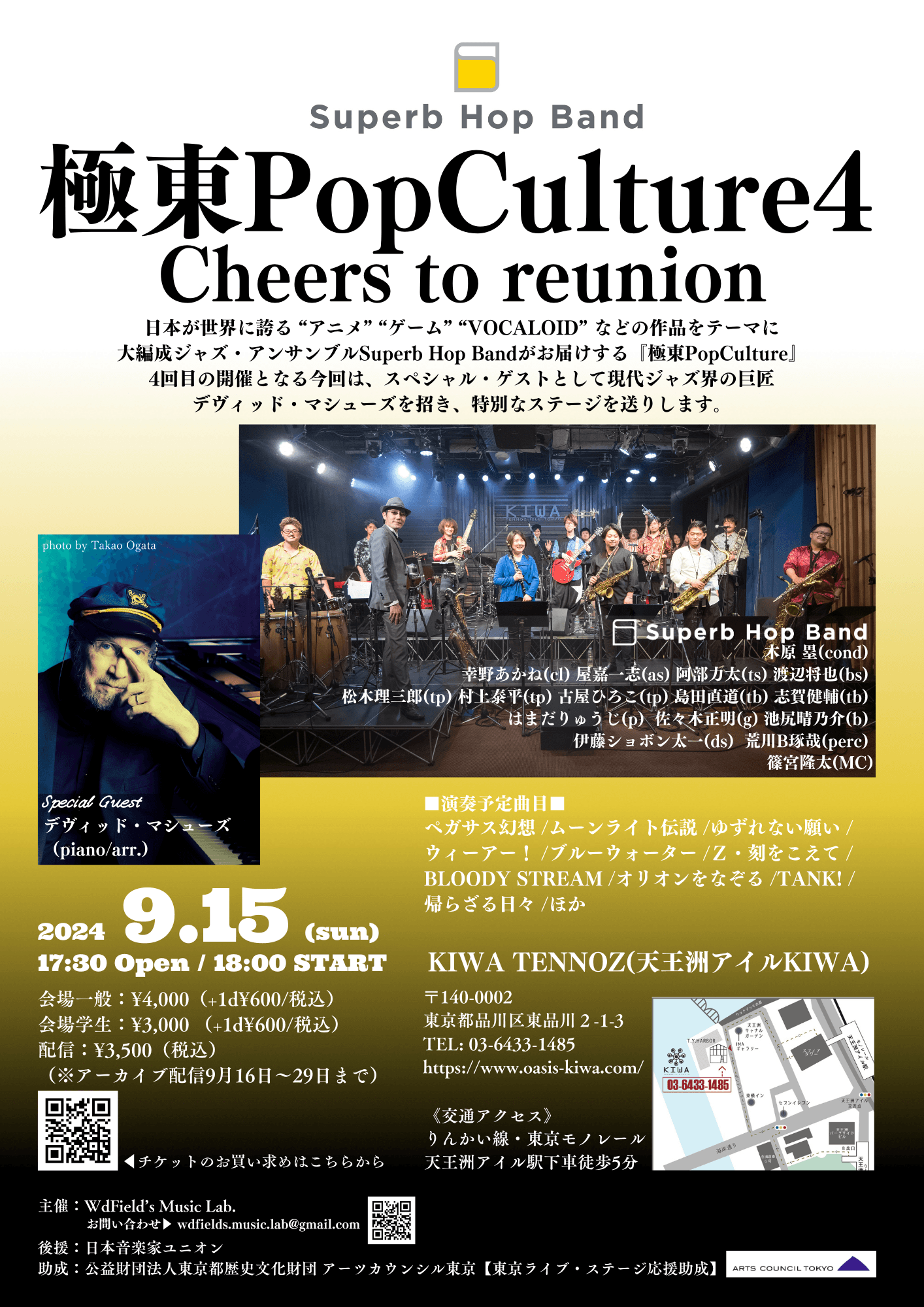 作・編曲家である木原 塁を中心に、様々な音楽ジャンルで活躍する若手~中堅プレイヤーによって2020年に結成されたジャズ・ラージ・アンサンブル「Superb Hop Band」。その4回目となるライブ『極東PopCulture4 Cheers to reunion』(主催:WdField's Music Lab.)を、2024年9月15日(日)に「天王洲アイルKIWA(東京都品川区東品川2-1-3)」で開催します。