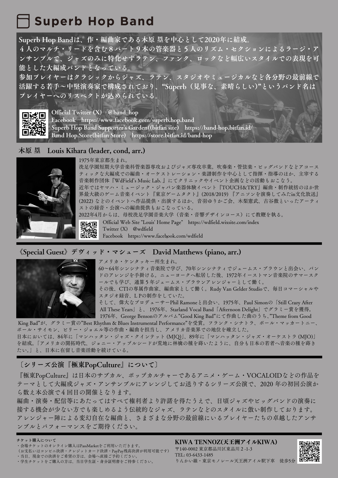 4回目となるSuperb Hop Bandによるシリーズ公演『極東PopCulture』は、1年間の休止を経て更に充実したレパートリーを掲げての開催となります。9本の管楽器と5人のリズムセクションという大編成ジャズ・アンサンブルのために装いを新たにした日本のサブカル・ポップカルチャーを彩った名曲の数々を、特別なサウンドで楽しめるステージです。過去3回のライブでは、様々な音楽ジャンルの第一線で活躍するメンバーによる極上のパフォーマンスと緻密なアンサンブルが繰り広げられ、各方面より好評を得ています。