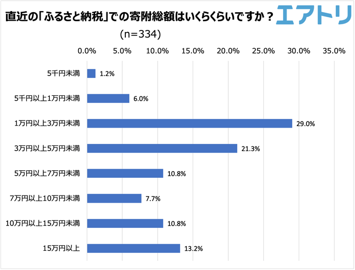 「ふるさと納税」を毎年している、数回したことがある人に、直近の「ふるさと納税」での寄附総額を聞いたところ、最も多い回答となったのは「1万円以上3万円未満」で29%、2位が「3万円以上5万円未満」で21.3%、3位は「15万円以上」で13.2%という結果でした。およそ3割の人が「1万円以上3万円未満」で「ふるさと納税」をしていることがわかりました。