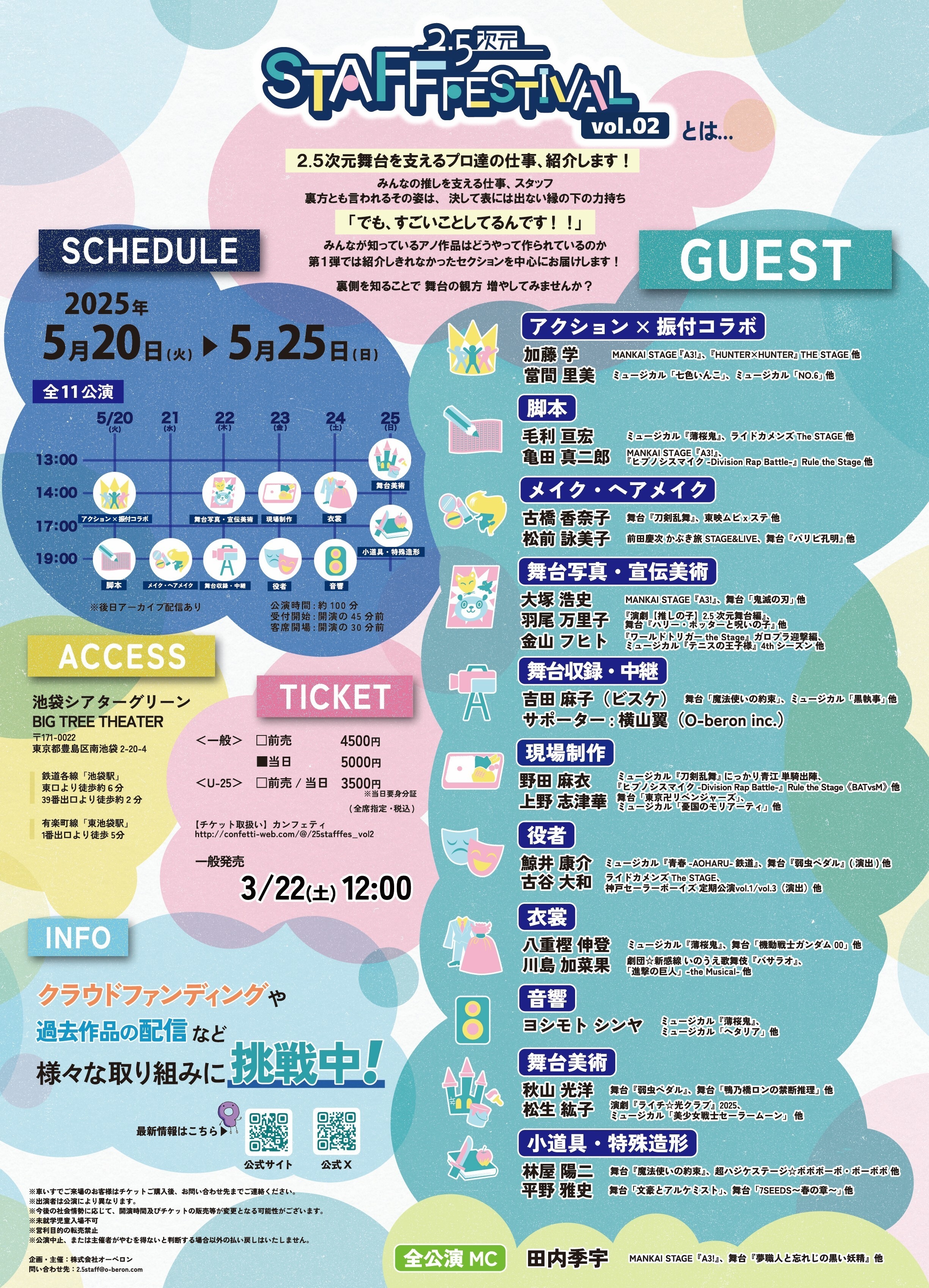 株式会社オーベロン(代表取締役:横山 翼)は、舞台スタッフを目指す学生に就職の門戸を広げ、観劇ファンには舞台の裏側を知る新たな楽しみ方を提供する「2.5次元スタッフフェスティバル vol.2」を、2025年5月20日(火)~25日(日)に池袋・シアターグリーンにて開催します。また6月15日までの期間、CAMPFIREにてクラウドファンディングを実施し、イベントの実現に向けた支援を募り、舞台業界の発展に寄与します。