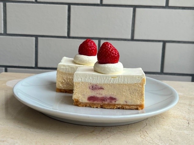 Megan - bar & patisserieで一番人気のチーズケーキに、期間限定でいちごを入れました。国産いちごで作った自家製コンフィチュールが甘酸っぱい、春にぴったりなチーズケーキです。定番のチーズケーキ同様、北海道産のクリームチーズ、バター、生クリームを使用し、さらに酸味のあるホワイトバルサミコを入れることで、いちごの味をより楽しめるように仕上げました。