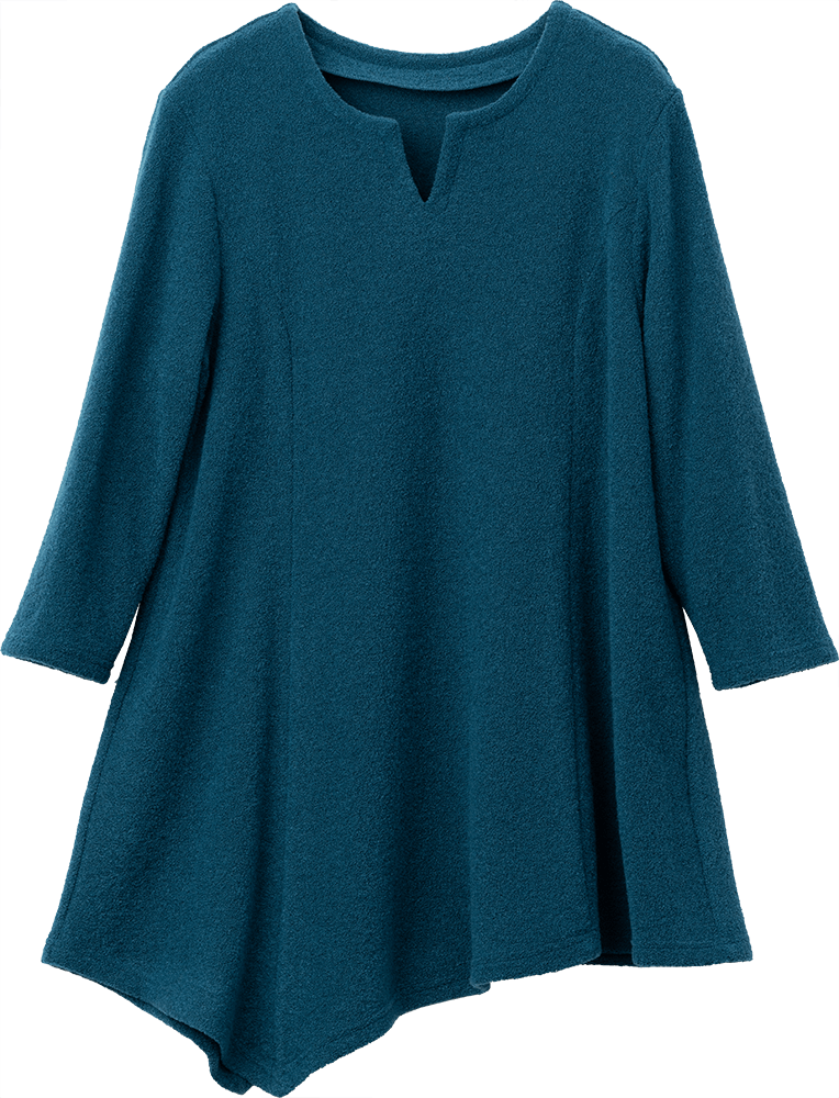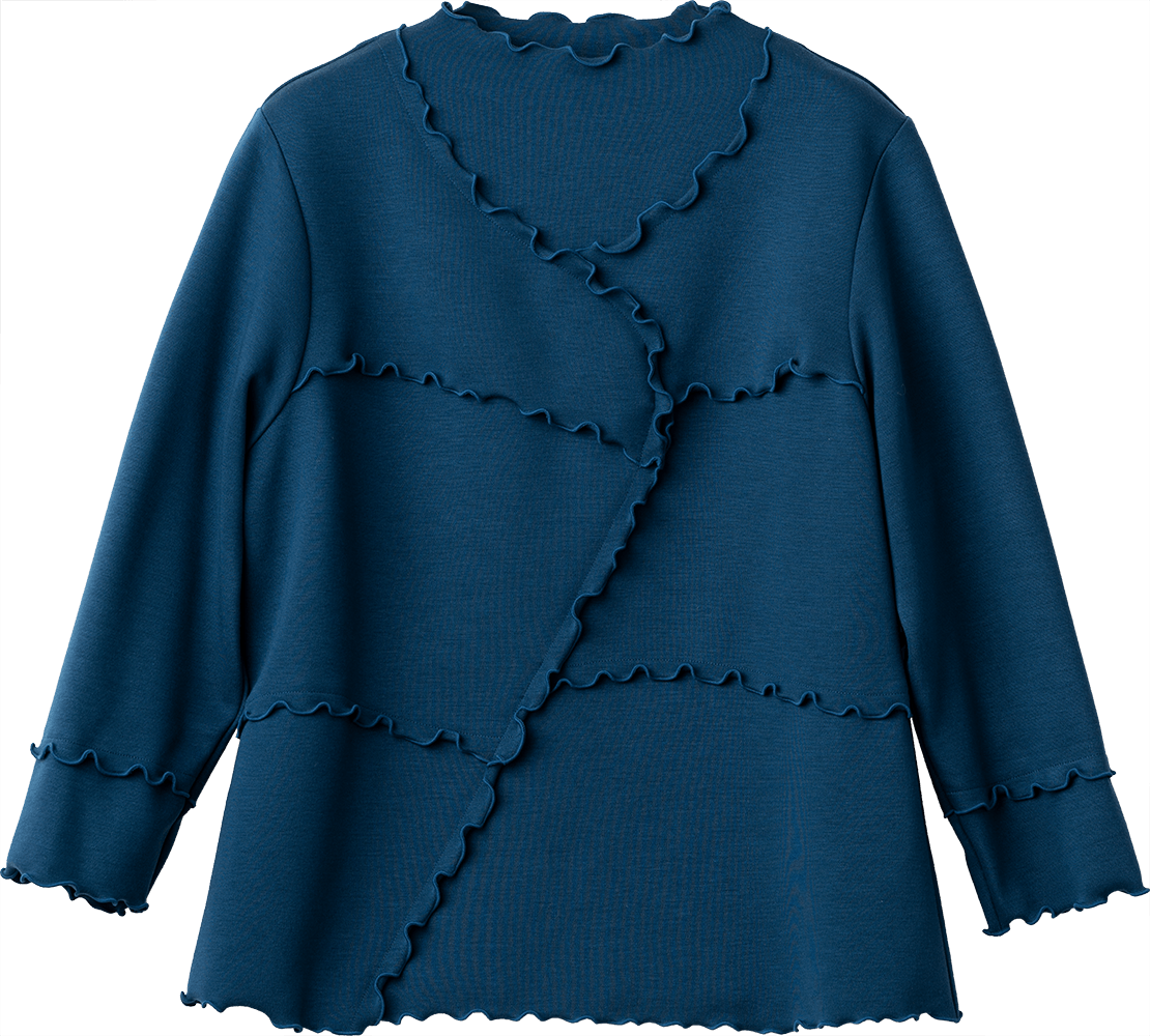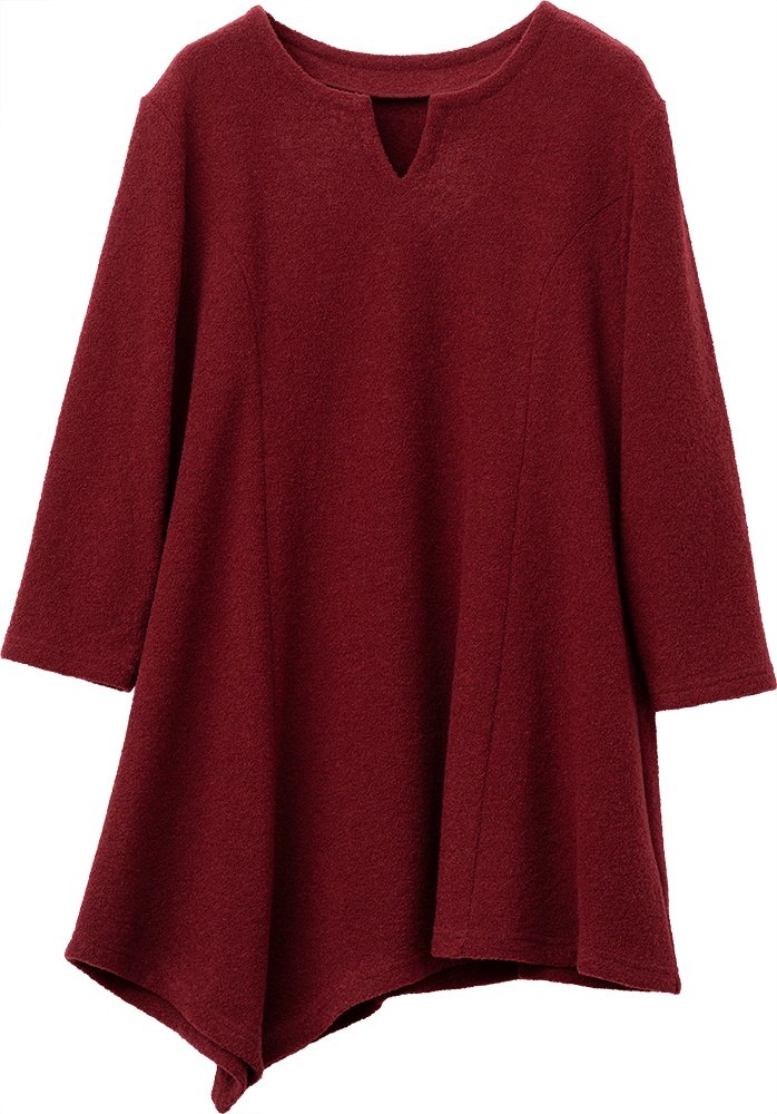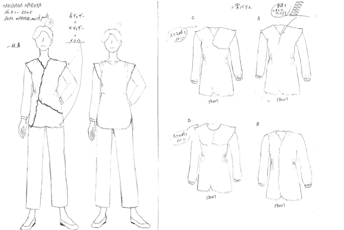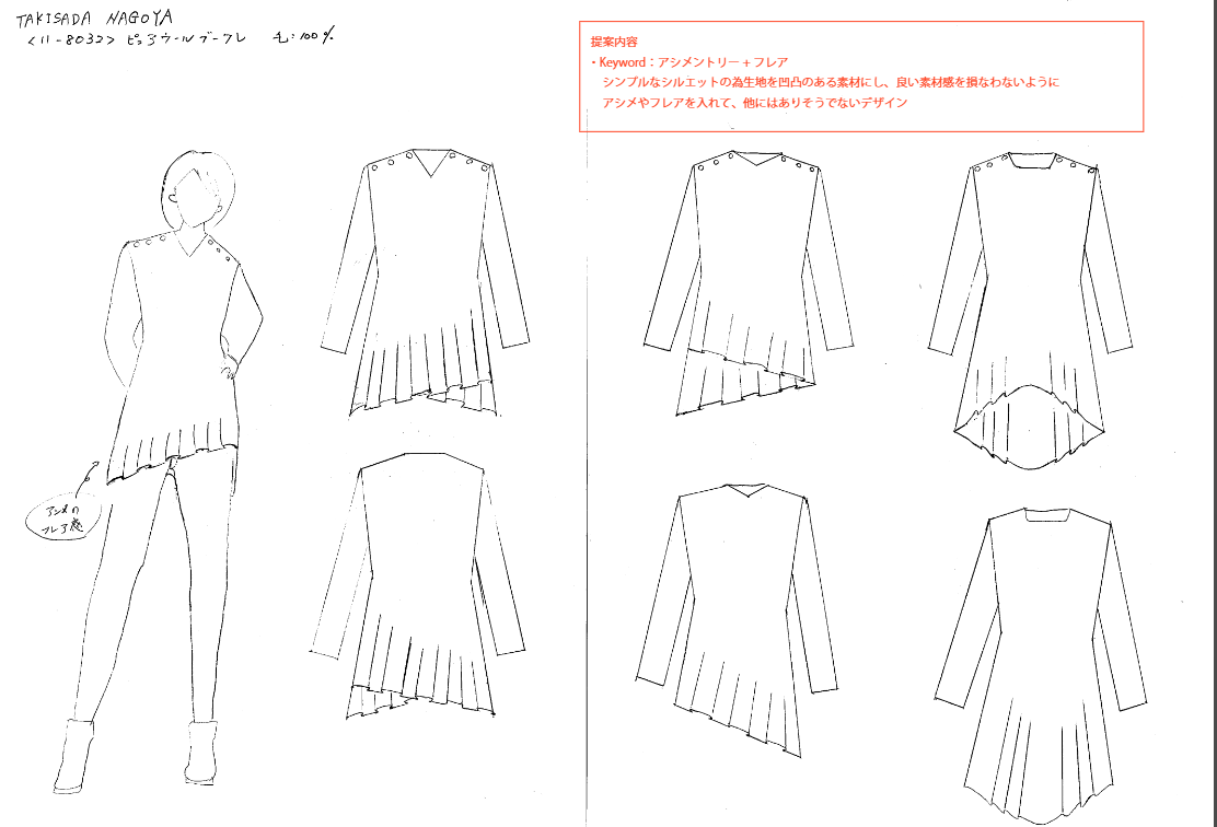 出来上がったアイテムは体系を上手にカバーしながらお洒落に着こなせて軽くて暖かい「ウールリングアシンメトリーデザインチュニック」(2color/予定売価19800円)