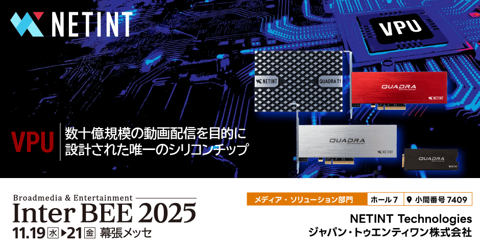 カナダ・バンクーバーに本社を置くネットイント社は、VPU(ビデオ処理ユニット)という新たなカテゴリを創出した企業であり、ASICベースのビデオ処理ソリューションにおけるイノベーターです。比類なきエンコード性能、高密度、そしてエネルギー効率を実現する技術を提供しています。ネットイント社のVPUは、映像分野におけるグリーンコンピューティングの先駆者として、エネルギー消費と運用コストを20~40倍削減しながら、10倍の処理密度を達成します。AV1、8K、HDRなどの高度なコーデック対応に加え、オンチップAIエンジンを搭載することで、ハイパースケールなメディアエンコードと処理の未来を切り拓いています。